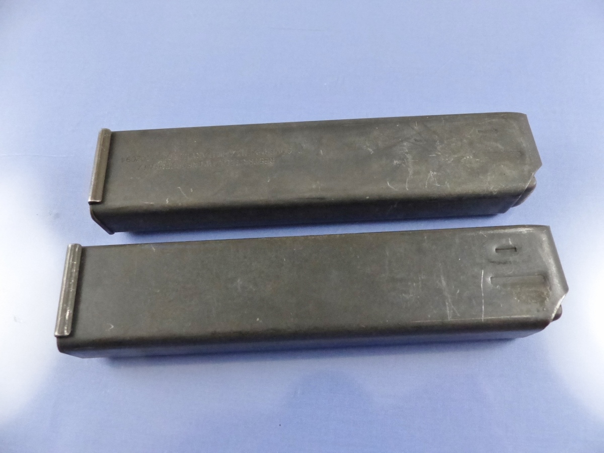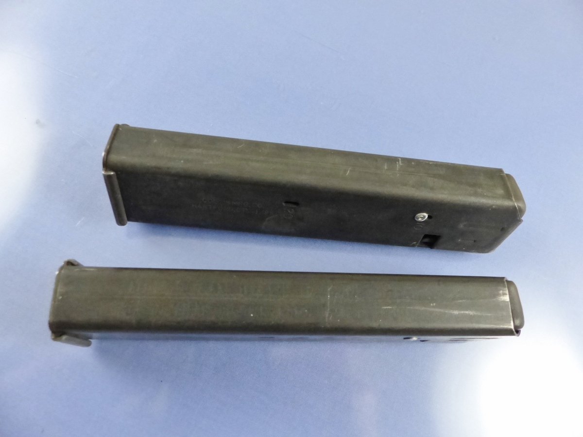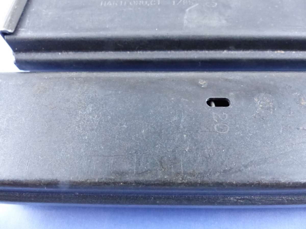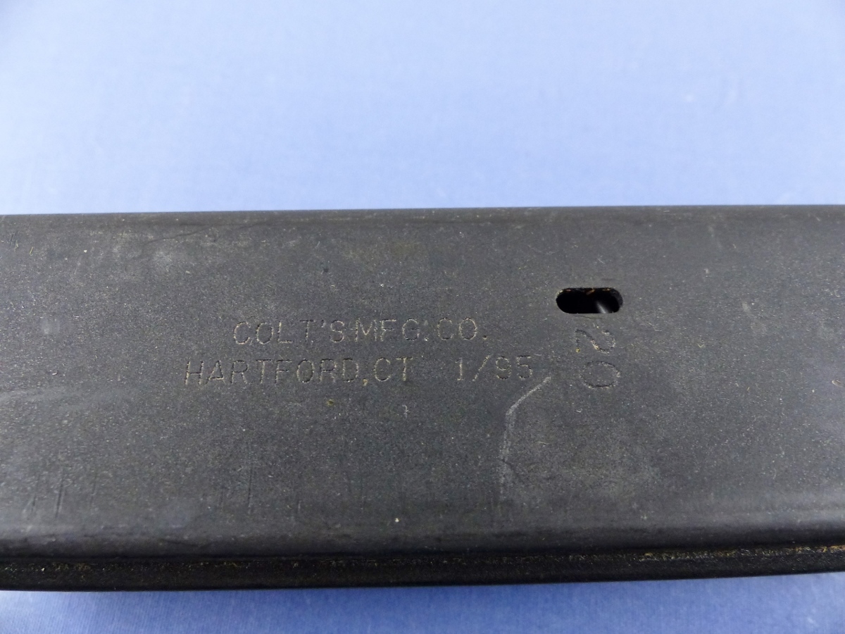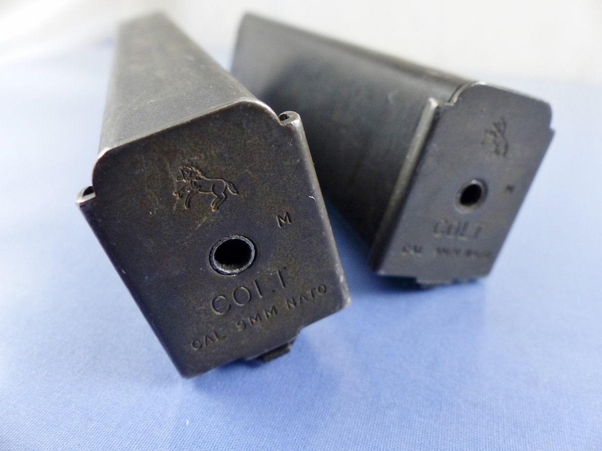 MAGAZINE MARKED: ONE is marked COLT LOGO, COLT, M, CAL 9MM NATO 10, 20 AND THE OTHER IS MARKED COLT LOGO, COLT, M, CAL 9MM NATO 10, 20 RESTRICTED LAW ENFORCEMENT etc. COLT’S MFG CO HARTFIELD CT 1/95